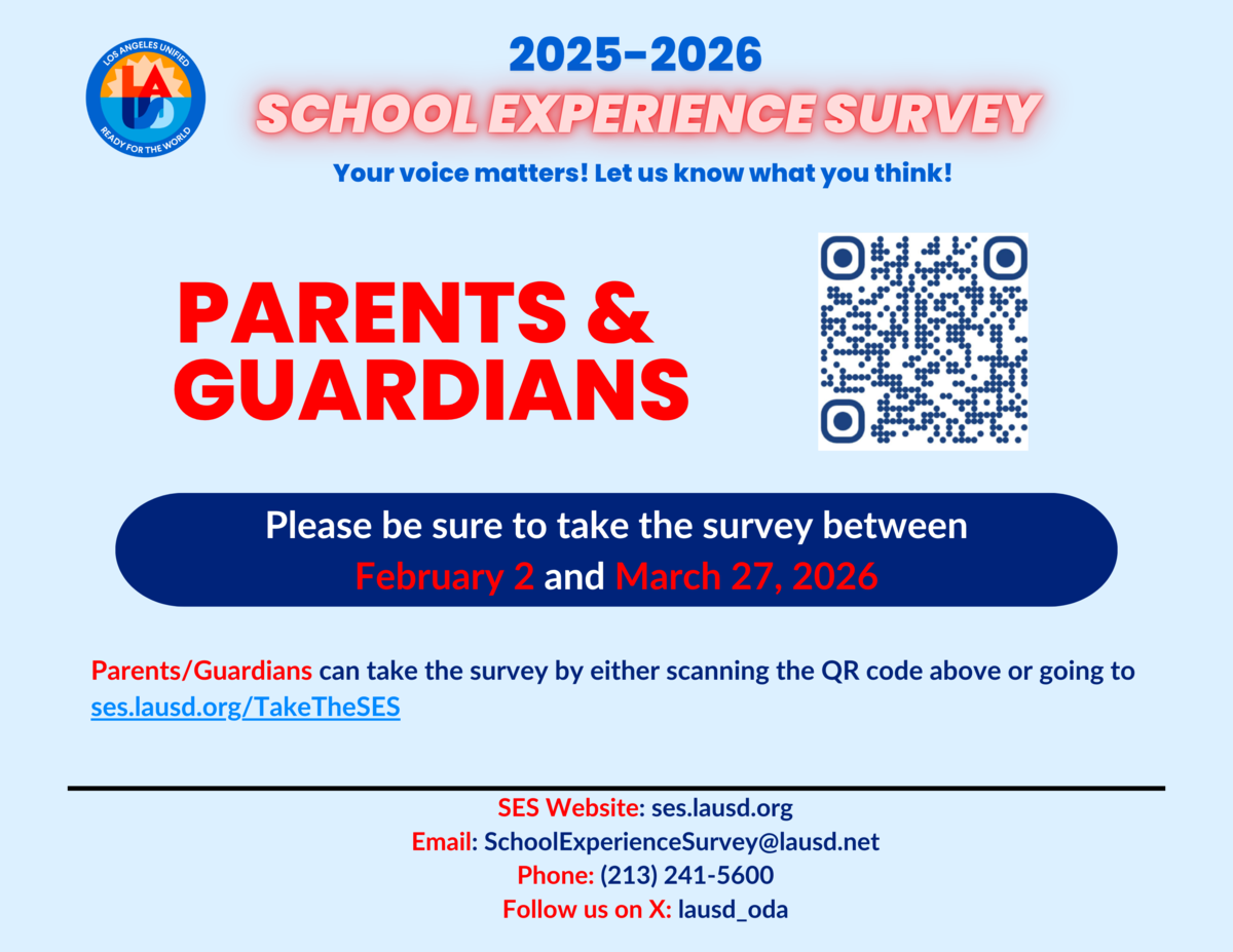 Padres, cuentenos sobre su experiencia con la Escuela John Adams! Como parte de nuestra comunidad escolar, sus opiniones son importantes. Valoramos sus comentarios y esperamos conocer su experiencia en nuestra escuela. Por favor, complete la encuesta en line en https://ses.lausd.org/TakeTheSES . La fecha limite para completar la encuesta es el Viernes 27 de Marzo del 2026.