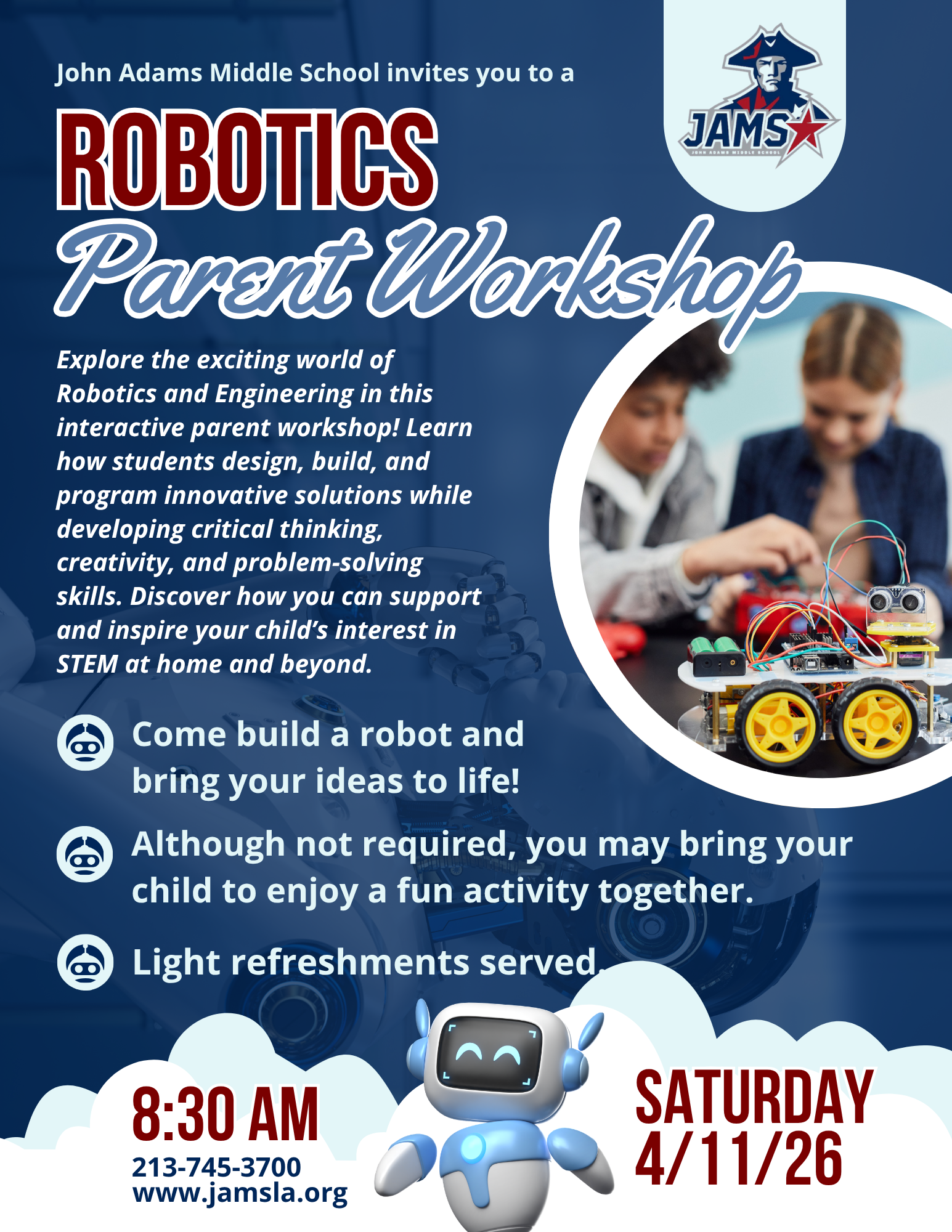 ¡Explora el emocionante mundo de la Robótica y la Ingeniería en este taller interactivo para padres! Aprende cómo los estudiantes diseñan, construyen y programan soluciones innovadoras mientras desarrollan el pensamiento crítico, la creatividad y las habilidades para resolver problemas. Descubre cómo puedes apoyar e inspirar el interés de tu hijo(a) en STEM en casa y más allá.