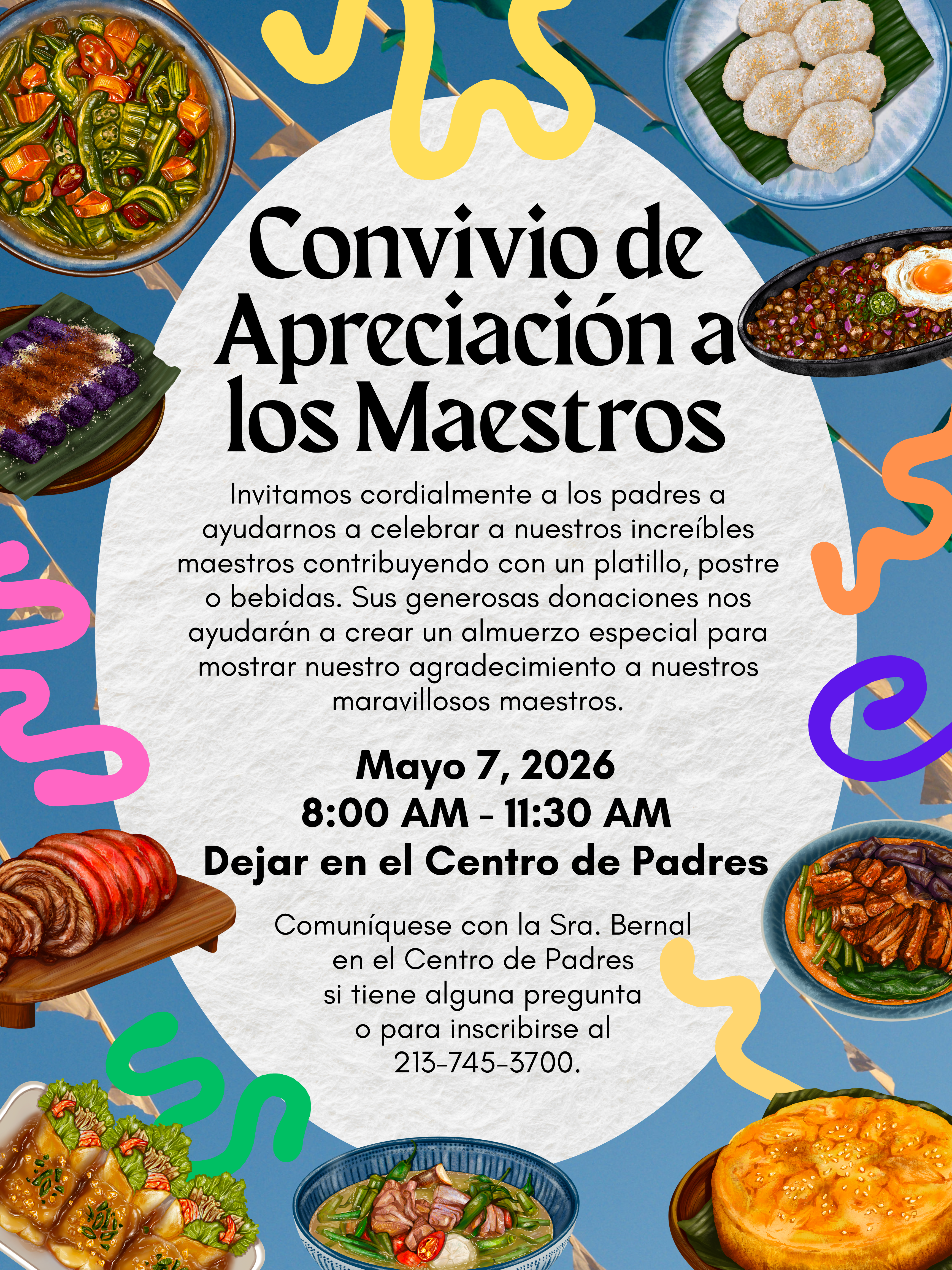 Invitamos cordialmente a los padres a ayudarnos a celebrar a nuestros increíbles maestros contribuyendo con un platillo, postre o bebidas. Sus generosas donaciones nos ayudarán a crear un almuerzo especial para mostrar nuestro agradecimiento a nuestros maravillosos maestros.